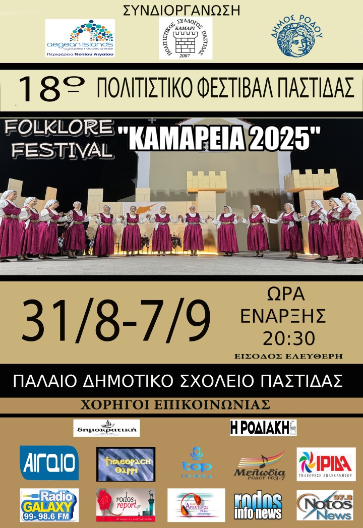 Ο Πολιτιστικός Σύλλογος Παστίδας Ρόδου «Καμάρι», σε συνεργασία με την περιφέρεια Νοτίου Αιγαίου και τον δήμο Ρόδου, σας προσκαλεί στο 18ο Πολιτιστικό Φεστιβάλ Παστίδας «Καμάρεια 2025». Η γιορτή θα πραγματοποιηθεί από 31 Αυγούστου έως 7 Σεπτεμβρίου 2025 στο Παλαιό Δημοτικό Σχολείο Παστίδας (δίπλα από το Κοινοτικό Κατάστημα).