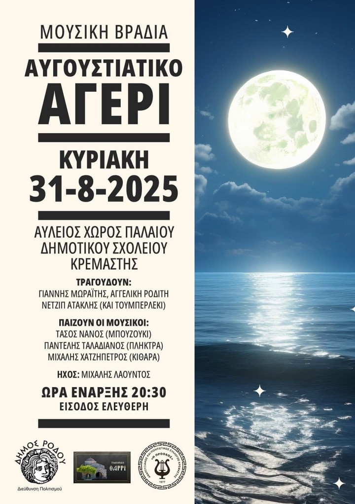 Την Κυριακή 31 Αυγούστου, στις 20:30, στον αυλόγυρο του παλιού Δημοτικού Σχολείου Κρεμαστής, το «Αυγουστιάτικο Αερί» θα γεμίσει από τις μελωδίες του καλού ελληνικού λαϊκού τραγουδιού. Σπουδαίοι καλλιτέχνες και ερμηνευτές θα σας ταξιδέψουν με το πλούσιο πρόγραμμά τους: