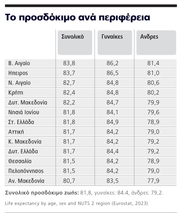 Σύμφωνα με τα στοιχεία της Eurostat (2023), οι γυναίκες της Ηπείρου οδηγούν την κούρσα της μακροβιότητας στην Ελλάδα. Σε μεικτούς μέσους όρους όμως ανδρών και γυναικών, οι μακροβιότεροι Ελληνες ζουν στα νησιά του Βορείου Αιγαίου, όπου το προσδόκιμο ζωής φτάνει τα 83,8 έτη.