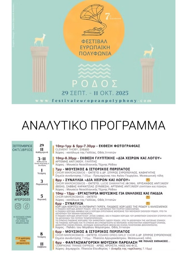 Η Ρόδος υποδέχεται για έβδομη συνεχή χρονιά το Φεστιβάλ Ευρωπαϊκής Πολυφωνίας, έναν διεθνή θεσμό αφιερωμένο στην κλασική μουσική, τις εικαστικές τέχνες και τον κινηματογράφο.