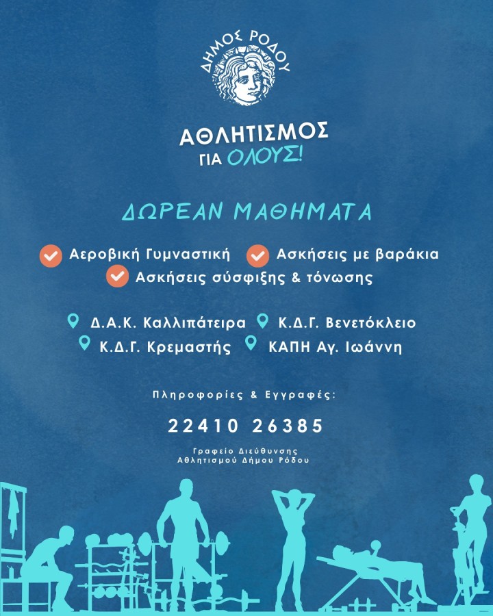 Ξεκίνησαν οι δηλώσεις συμμετοχής για το πρόγραμμα του Δήμου Ρόδου «Αθλητισμός για όλους» με αεροβική γυμναστική, ασκήσεις με βαράκια και ασκήσεις σύσφιξης και τόνωσης στο ΔΑΚ "Καλλιπάτειρα", στο κλειστό Κρεμαστής, στο Βενετόκλειο και το ΚΑΠΗ Αγίου Ιωάννη.