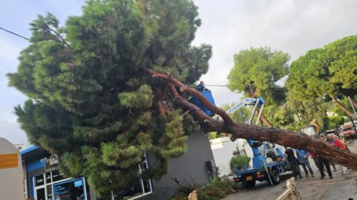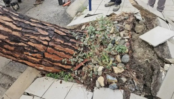 Μετά την έντονη και διαρκή νεροποντή της Τρίτης, το δέντρο δεν άντεξε και έπεσε. Οι ρίζες του πεύκου, σήκωσαν το δάπεδο παρακείμενης επιχείρησης που πουλάει πανιά για ιστιοφόρα.