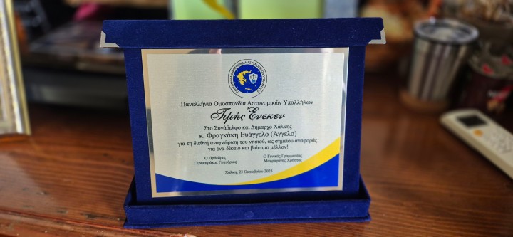 Σε μια ιδιαίτερα συγκινητική στιγμή, η Πανελλήνια Ομοσπονδία Αστυνομικών Υπαλλήλων (ΠΟΑΣΥ) τίμησε τον δήμαρχο Χάλκης κ. Φραγκάκη Ευάγγελο, το πολυσήμαντο έργο και την προσφορά του τόσο στην τοπική κοινωνία όσο και στη χώρα συνολικά.