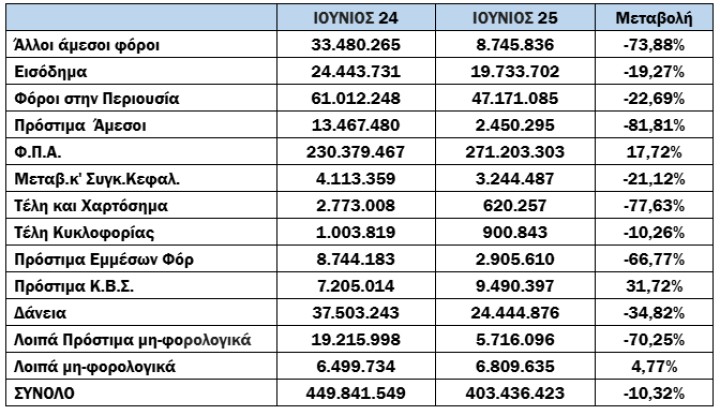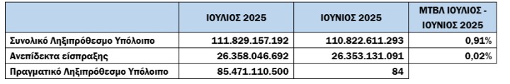 Για τον μήνα αναφοράς (Ιούνιος), το νέο ληξιπρόθεσμο έφτασε τα 375 εκατ. €, ενώ την αντίστοιχη περίοδο του 2024 είχε φτάσει τα 407 εκατ. € (μείωση κατά 7,86%).