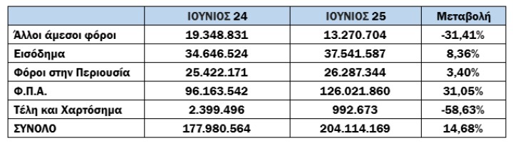 Για το μήνα αναφοράς (Ιούνιος) οι συνολικές εισπράξεις έναντι νέου ληξιπρόθεσμου (εκτός 10 ΜΦΚ) έφτασαν τα 216 εκατ. €, ενώ την ίδια περίοδο του 2024 είχαν φτάσει τα 191 εκατ. € (αύξηση κατά 13,09%).