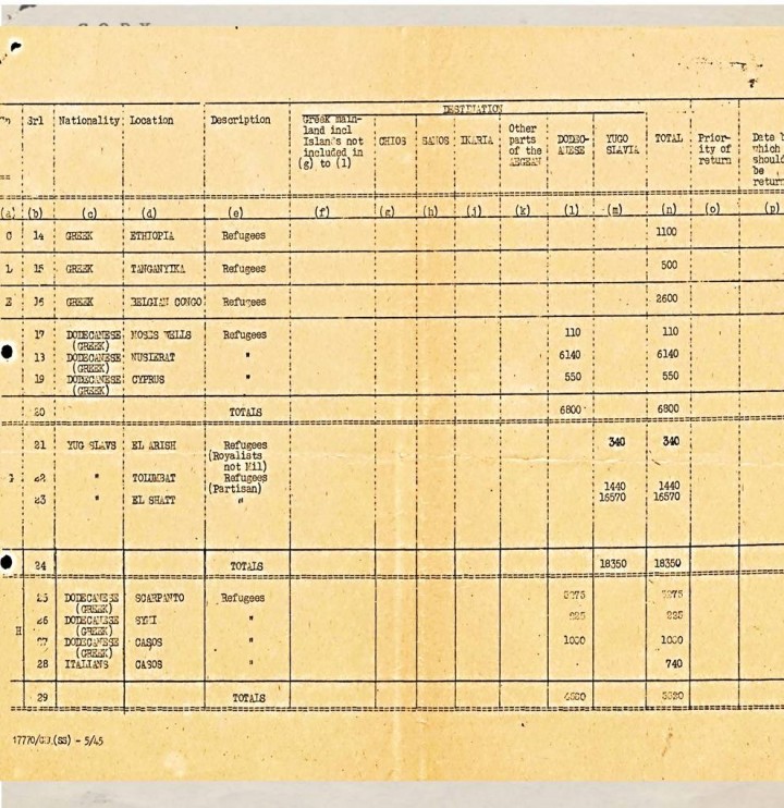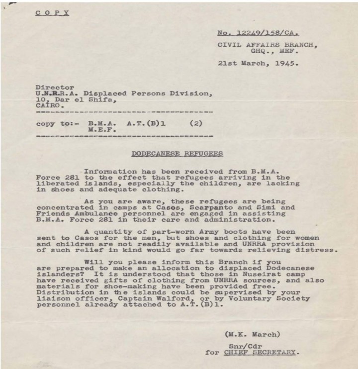 Σύμφωνα με τα επίσημα συμμαχικά αρχεία, στην περιοχή φιλοξενήθηκαν συνολικά 5.340 πρόσφυγες Δωδεκανήσιοι: 3.375 στην Κάρπαθο, 1.000 στην Κάσο, 740 Ιταλοί επίσης στην Κάσο και 225 Έλληνες στη Σύμη. Στον Αφιάρτη, εκεί όπου βρισκόταν το κατεστραμμένο ιταλικό στρατιωτικό αεροδρόμιο, δημιουργήθηκε οργανωμένος προσφυγικός συνοικισμός. Την κατασκευή ανέλαβε η 660 Artisan Works Company του βρετανικού στρατού, υπό τον λοχία Tucker (BEM, Royal Engineers). Μέσα σε λίγες ημέρες στήθηκε ένας πλήρως λειτουργικός καταυλισμός με μαγειρεία, αποθήκες και σκηνές, που μπορούσαν να εξυπηρετήσουν σημαντικό αριθμό προσφύγων .