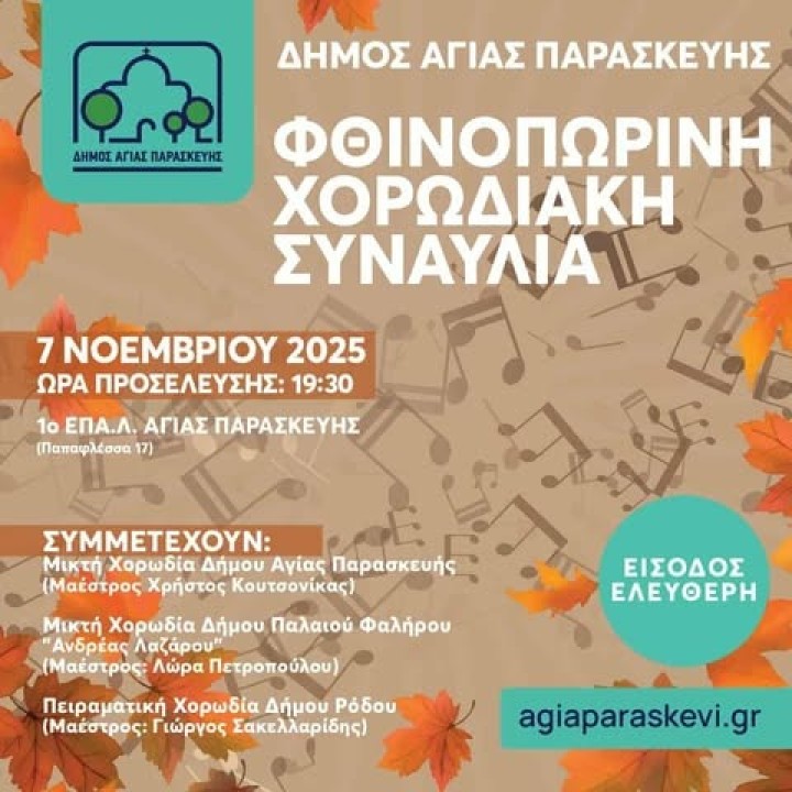 Αύριο, Παρασκευή 7 Νοεμβρίου, η Χορωδία θα εκπροσωπήσει το νησί της Ρόδου στη Συνάντηση Χορωδιών του Δήμου Αγίας Παρασκευής, στην Αθήνα, που διοργανώνει η Μικτή Χορωδία Αγίας Παρασκευής. Η εκδήλωση αναμένεται να συγκεντρώσει σημαντικά φωνητικά σύνολα από διάφορες περιοχές της χώρας, σε μια βραδιά αφιερωμένη στη δύναμη της χορωδιακής μουσικής.
