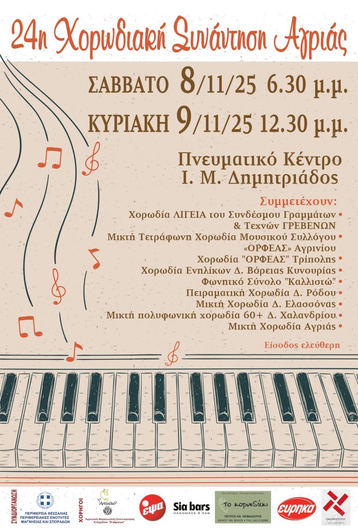 Η επόμενη στάση θα είναι ο Βόλος, όπου την Κυριακή 9 Νοεμβρίου η Πειραματική Χορωδία θα λάβει μέρος σε αντίστοιχη Συνάντηση Χορωδιών, την οποία οργανώνει η Μικτή Χορωδία Δημοτικής Ενότητας Αγριάς του Δήμου Βόλου.