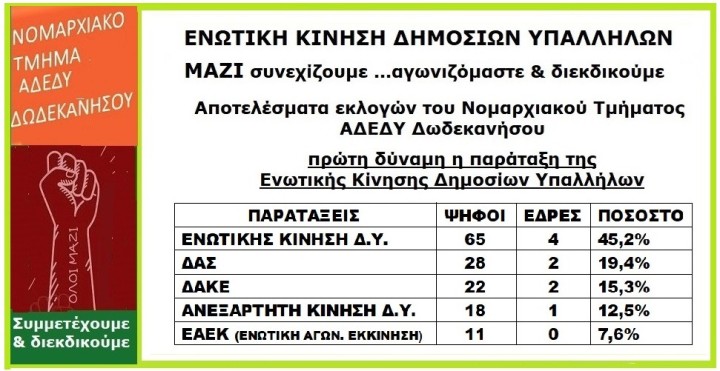 Με μεγάλη συμμετοχή πραγματοποιήθηκαν οι εκλογές για την ανάδειξη της νέας Εκτελεστικής Γραμματείας στο Νομαρχιακό Τμήμα της ΑΔΕΔΥ Δωδεκανήσου, όπου από τους 155 αντιπροσώπους ψήφισαν οι 144. Πρώτη δύναμη αναδείχθηκε η ΕΝΩΤΙΚΗ ΚΙΝΗΣΗ ΔΗΜΟΣΙΩΝ ΥΠΑΛΛΗΛΩΝ, συγκεντρώνοντας το μεγαλύτερο ποσοστό ψήφων ανάμεσα στις παρατάξεις που συμμετείχαν.