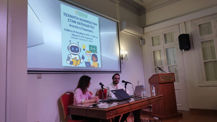 Οι εισηγητές, κα Μαρία Κλαδάκη και κ. Παναγιώτης Αλεξόπουλος, ανέδειξαν τον ρόλο της Τεχνητής Νοημοσύνης ως σύμμαχο για εκπαιδευτικούς και μαθητές, επισημαίνοντας τη σημασία της κριτικής και συνειδητής χρήσης της τεχνολογίας.