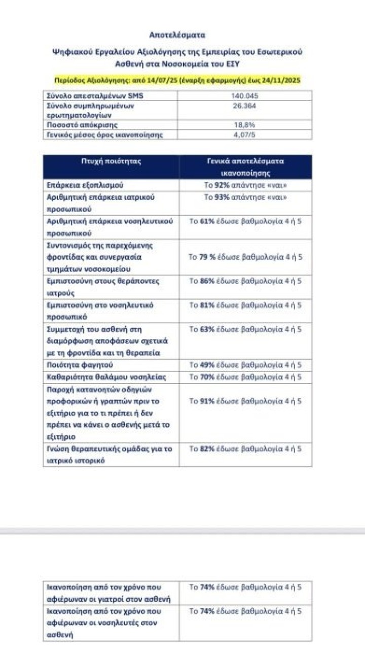 Όπως προκύπτει από τα ίδια δεδομένα, οι ασθενείς αξιολόγησαν θετικά την επάρκεια εξοπλισμού και προσωπικού, σε ποσοστό 92% και 93% αντίστοιχα. Όμως δύο σοβαρά ζητήματα παραμένουν «αγκάθια»: η έλλειψη νοσηλευτών και η ποιότητα της σίτισης, που εξακολουθούν να συγκεντρώνουν τις χαμηλότερες βαθμολογίες.