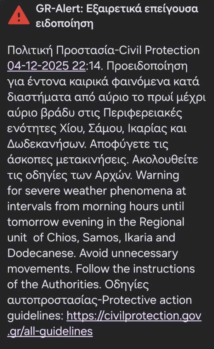 Λίγο μετά τις 22:00 το βράδυ, η Πολιτική Προστασία απέστειλε εξαιρετικά επείγουσα ειδοποίηση μέσω του συστήματος GR-Alert, προειδοποιώντας για την εκδήλωση έντονων καιρικών φαινομένων που θα επηρεάσουν σειρά νησιών του Ανατολικού Αιγαίου και των Δωδεκανήσων από το πρωί της Παρασκευής έως και το βράδυ της ίδιας ημέρας.