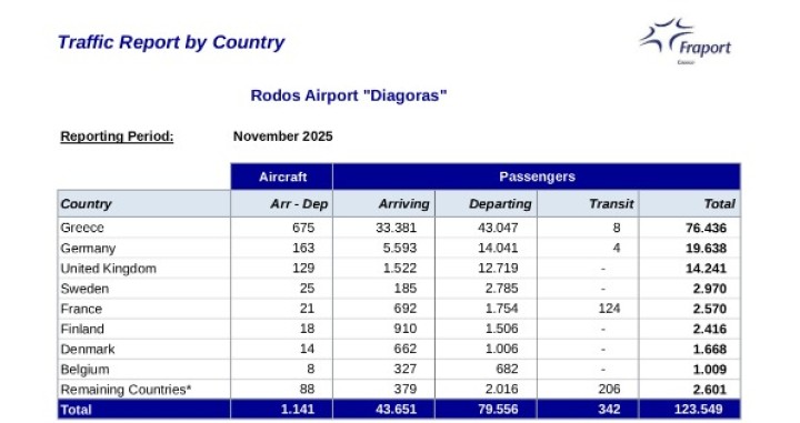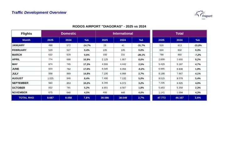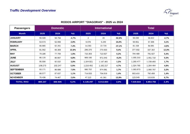 Αξίζει να σημειωθεί, ότι φέτος τον Νοέμβριο, τα αεροδρόμια του δικτύου της Fraport Greece διακίνησαν συνολικά 953.000 επιβάτες, σημειώνοντας αύξηση 8,8% σε σχέση με τον Νοέμβριο του 2024 και μάλιστα, η επίδοση του αεροδρομίου της Ρόδου καταγράφεται στα σημαντικά ορόσημα της χρονιάς.