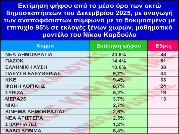 Νίκος Καρδούλας: Εκτίμηση ψήφου σύμφωνα με τον μέσο όρο των οκτώ δημοσκοπήσεων του Δεκεμβρίου 2025
