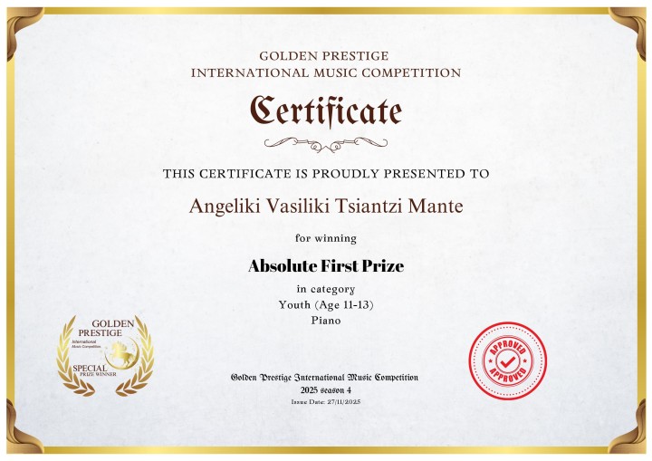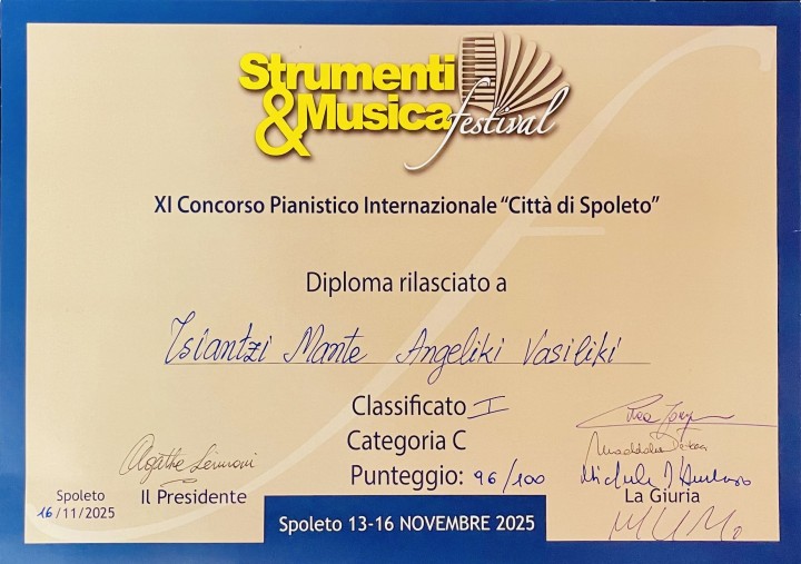 Σημαντικότατες διεθνείς επιτυχίες σημείωσε σε διάστημα μόλις ενός μήνα, η 13χρονη πιανίστρια Αγγελίνα Τσιαντζή Μαντέ, μαθήτρια του Μουσικού Σχολείου Ρόδου, κατακτώντας χρυσά μετάλλια σε τέσσερις διεθνείς μουσικούς διαγωνισμούς και επιβεβαιώνοντας το εξαιρετικά υψηλό καλλιτεχνικό της επίπεδο σε πολύ νεαρή ηλικία.