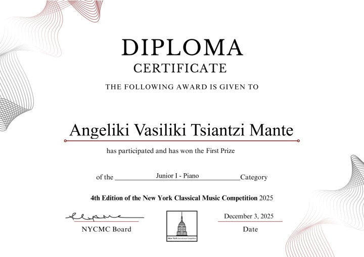 Μετά τις επιτυχίες της στην Ευρώπη, ακολούθησε ο θρίαμβος στην Αμερική, όπου η νεαρή Αγγελίνα κατέκτησε το 1ο Βραβείο στον διεθνή διαγωνισμό New York Classical Music Competition (NYCMC) 2025, αποδεικνύοντας για μία ακόμη φορά τη δυναμική της παρουσία σε διεθνές επίπεδο.