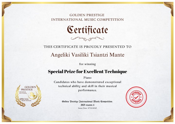 Επιπλέον, αναδείχθηκε Grand Prize Winner στον διεθνή διαγωνισμό Los Angeles International Online Music Competition 2025, επιβεβαιώνοντας ότι η μουσική της παρουσία ξεπερνά γεωγραφικά σύνορα και ηλικιακές κατηγορίες. Η ερμηνεία της απέσπασε εξαιρετικές βαθμολογίες από καταξιωμένους μουσικούς σε όλο τον κόσμο, επιβεβαιώνοντας την καθολική αναγνώριση του ταλέντου της.