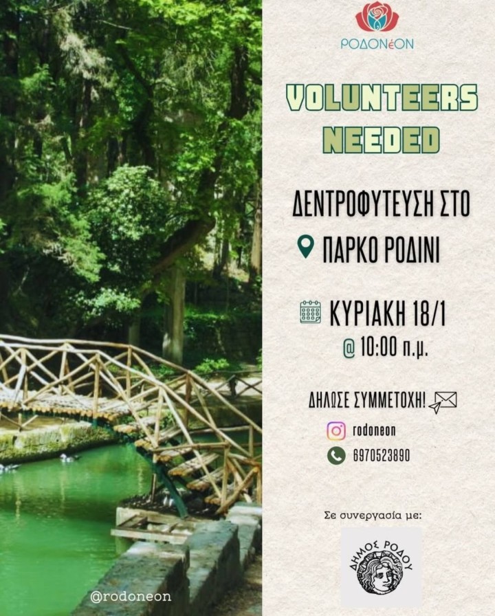 Η Κυριακή 18 Ιανουαρίου, 10:00 το πρωί, θα είναι μια διαφορετική μέρα στο Πάρκο Ροδίνι. Με την υποστήριξη του δήμου Ρόδου και την ενεργό συμμετοχή της εθελοντικής ομάδας «ΡΟΔΟΝέΟΝ», ετοιμαζόμαστε να φυτέψουμε σπόρους — όχι μόνο για να δημιουργήσουμε μια πιο «πράσινη» πόλη, αλλά και για να σπείρουμε τον σπόρο της Ελπίδας και της Φροντίδας για το περιβάλλον.