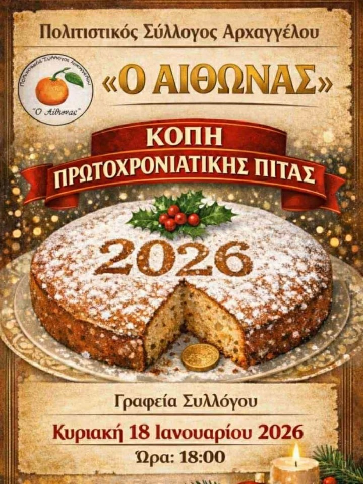 Στα γραφεία του στην πλατεία «Αφεντικά», ο Πολιτιστικός Σύλλογος Αρχαγγέλου «Ο Αίθωνας» θα πραγματοποιήσει την Κυριακή 18 Ιανουαρίου και ώρα 18.00 την εκδήλωση για την κοπή της πίτας του. Με ανακοίνωσή του προσκαλεί όλους όσοι τον στηρίζουν κι εκτιμούν το έργο του να είναι παρόντες στο ξεκίνημα του 2026 κι ενόψει σημαντικών δράσεων τους επόμενους μήνες.