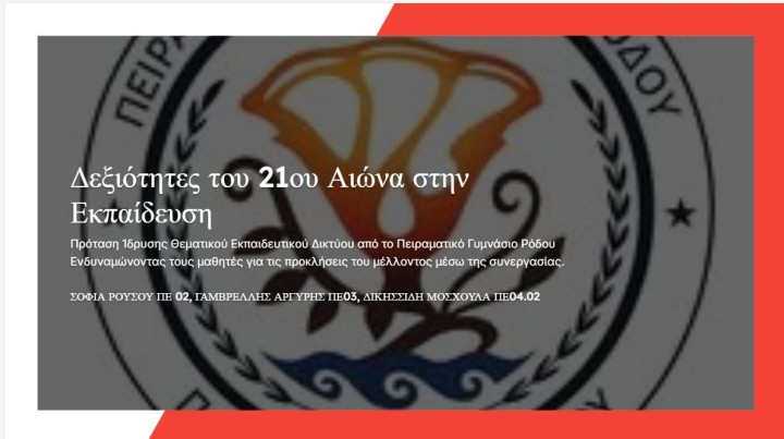 «Τη Δευτέρα 2 Φεβρουαρίου στις 5:00 π.μ πραγματοποιήθηκε η πρώτη διαδικτυακή συνάντηση του Πανελλήνιου Δικτύου με τίτλο “Δεξιότητες του 21ου Αιώνα”, με τη συμμετοχή έξι (6) Προτύπων και Πειραματικών Γυμνασίων από διαφορετικές περιοχές της χώρας (1ο Πειραματικό Γυμνάσιο Σάμου με λυκειακές τάξεις, 5ο Πειραματικό Γυμνάσιο Κομοτηνής, 4ο Πειραματικό Λύκειο Τρικάλων, 6ο Πειραματικό Γυμνάσιο Αλεξανδρούπολης, 4ο Πειραματικό Γυμνάσιο Λαμίας, 2ο Πειραματικό ΓΕΛ Ιεράπετρας). Η συνάντηση είχε χαρακτήρα εισαγωγικό και οργανωτικό και αποτέλεσε το εναρκτήριο βήμα για τη συγκρότηση και τη λειτουργία του Δικτύου κατά το τρέχον σχολικό έτος.
