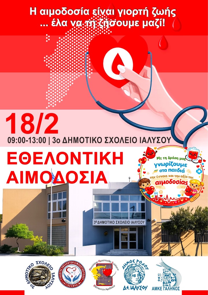 Μια απλή πράξη μπορεί να κάνει τη διαφορά. Το 3ο Δημοτικό Σχολείο Ιαλυσού καλεί όλους τους εθελοντές να συμμετάσχουν σε αυτή τη γιορτή ζωής, δείχνοντας ότι η προσφορά και η αλληλεγγύη ξεκινούν από τα σχολεία και φτάνουν στην «καρδιά» της κοινότητας.