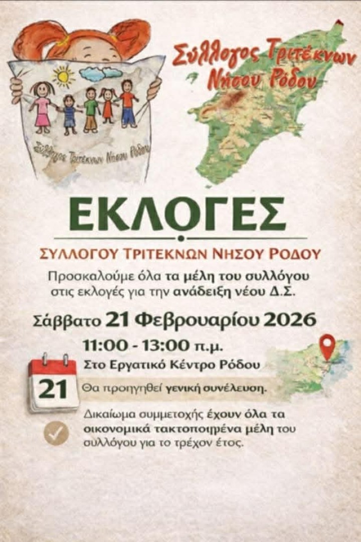 Ο Σύλλογος Τριτέκνων Νήσου Ρόδου καλεί όλα τα μέλη του να συμμετάσχουν στις προσεχείς εκλογές για την ανάδειξη νέου Διοικητικού Συμβουλίου, οι οποίες θα πραγματοποιηθούν το Σάββατο 21 Φεβρουαρίου 2026, από τις 11:00 έως τις 13:00, στο Εργατικό Κέντρο Ρόδου.