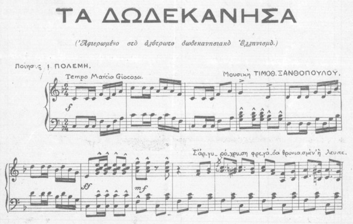 Το τραγούδι «Δωδεκάνησα», με τις επισημάνσεις «εμβατήριον» και «δι άσμα και κλειδοκύμβαλον», σε μουσική του Τιμόθεου Ξανθόπουλου και στίχους του Ιωάννη Πολέμη, κυκλοφόρησε από τον εκδοτικό οίκο Φέξη στην Αθήνα. Αντίτυπο της παρτιτούρας εντοπίστηκε στο Αρχείο της Μεγάλης Μουσικής Βιβλιοθήκης της Ελλάδος «Λίλιαν Βουδούρη».