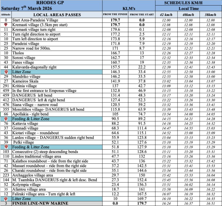 Το «Rhodes GP» θα έχει εκκίνηση το Σάββατο μέσα από το Παραδείσι στις 12.00 και ο τερματισμός είναι προγραμματισμένος στη Νέα Μαρίνα, από τις 16.24 έως τις 16.51, αναλόγως της ταχύτητας των ποδηλατών.