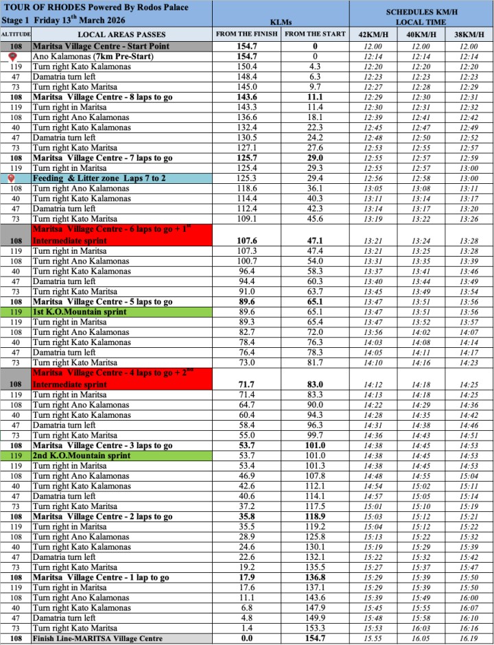 Το κυρίως μέρος της τελευταίας φετινής διοργάνωσης στο πλαίσιο των Διεθνών Ποδηλατικών Αγώνων Ρόδου ξεκινά ουσιαστικά σήμερα. Μετά τον χθεσινό «πρόλογο» στο Μόντε Σμιθ, οι ποδηλάτες θα πάρουν εκκίνηση για το 1ο ΕΤΑΠ του «Tour of Rhodes» στις 12.00 μέσα από τα Μαριτσά κι αναμένεται να τερματίσουν κάπου στις 16.00, ξανά μέσα στο χωριό, αναλόγως της ταχύτητας που θα κινείται ο καθένας.