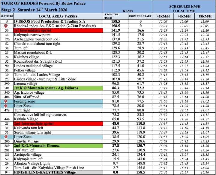 Εκκίνηση στις 12.00 από τις εγκαταστάσεις της «Ιβίσκος Food Service» στις 12.00 προς Ρόδου-Λίνδου έξω από Κολύμπια-Αρχάγγελο-Χαράκι-Μάσσαρι-Κάλαθο-Λίνδο-Συνέχεια προς Πέυκους-Λάρδο-Λάερμα-Άγιο Ισίδωρο-Κρητηνία-Καλαβάρδα-Σορωνή-Διμυλιλα-Ελεούσα-Αρχίπολη-Κολύμπια-Ρόδου-Λίνδου-έξω από Αφάντου-Στροφή προς Καλυθιές και τερματισμός στο χωριό από 15.46 έως 16.10.