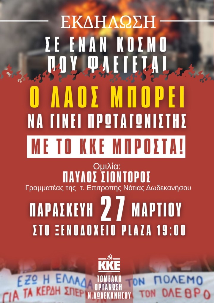 Η Τομεακή Οργάνωση Νότιας Δωδεκανήσου του ΚΚΕ πραγματοποιεί εκδήλωση την Παρασκευή 27 Μαρτίου στις 19:00 στην αίθουσα του ξενοδοχείου Plaza με θέμα: «Σε έναν κόσμο που φλέγεται, σε ένα σύστημα που σαπίζει, ο λαός έχει την δύναμη να γίνει πρωταγωνιστής των εξελίξεων με το ΚΚΕ μπροστά!». Θα μιλήσει ο Παύλος Σιόντορος, Γραμματέας της Τομεακής Επιτροπής Ν.Δωδεκανήσου.