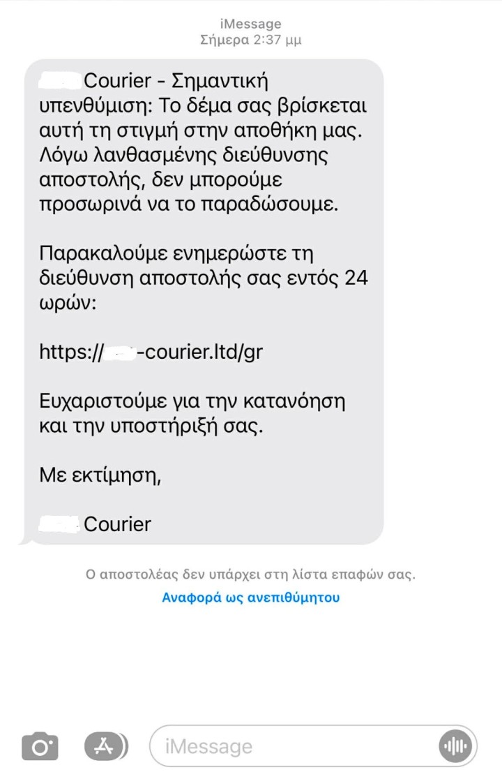 Ένα από τα πιο συνηθισμένα σενάρια αφορά τα ψεύτικα μηνύματα (SMS) που λαμβάνουμε στα κινητά μας, τα οποία υποτίθεται ότι προέρχονται από εταιρείες ταχυμεταφορών. Τα μηνύματα αυτά αναφέρουν συνήθως ότι υπάρχει κάποιο πρόβλημα με την παράδοση ενός δέματος, όπως λανθασμένη διεύθυνση ή εκκρεμότητα πληρωμής, και μας καλούν να πατήσουμε σε έναν σύνδεσμο για να «διορθώσουμε» το πρόβλημα.