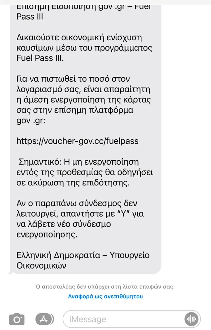 Πρόσφατα μάλιστα, οι απατεώνες προχώρησαν ένα βήμα παραπέρα, εκμεταλλευόμενοι και κρατικά προγράμματα οικονομικής ενίσχυσης των πολιτών, όπως το fuel pass. Έστειλαν δήθεν μηνύματα από το υπουργείο Οικονομικών που ενημερώνουν τους πολίτες ότι δικαιούνται επίδομα καυσίμων και τους προτρέπουν να πατήσουν σε σχετικό σύνδεσμο για να το λάβουν. Φυσικά, πρόκειται για άλλη μία παγίδα με στόχο την υποκλοπή στοιχείων. (Επισυνάπτεται σχετική φωτο και από αυτό το μήνυμα).