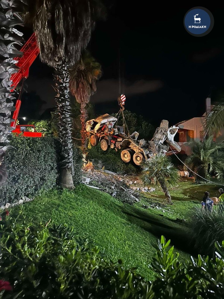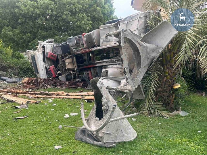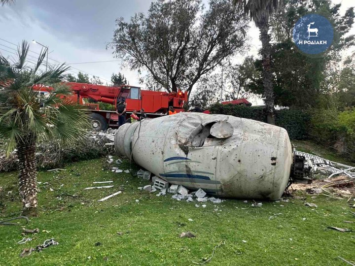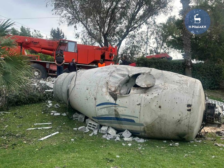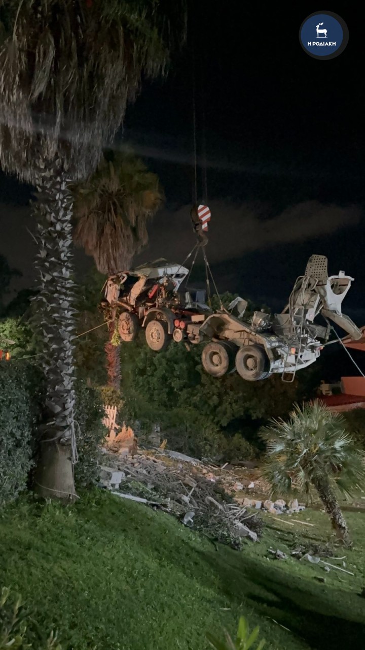Ολοκληρώθηκε η διαδικασία απομάκρυνσης της μπετονιέρας η οποία το μεσημέρι είχε καταλήξει μέσα σε αυλή σπιτιού στη Ρόδο