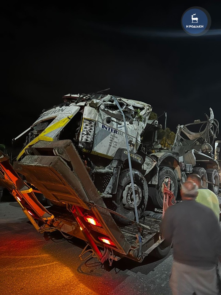 Χρειάστηκε δε, αρχικά να αποκολληθεί η μπετονιέρα από το υπόλοιπο όχημα βαρέου τύπου προκειμένου να γίνει εφικτή η απομάκρυνση τους από το σημείο του ατυχήματος. Με τη βοήθεια γερανού αρχικά απομακρύνθηκε η μπετονιέρα η οποία μεταφορτώθηκε σε νταλίκα και με τον ίδιο τρόπο στη συνέχεια μετακινήθηκε η καμπίνα και το λοιπό όχημα. Όπως είναι γνωστό, το ατύχημα συνέβη σήμερα στη 1.30μ.μ.τ ο μεσημέρι και ευτυχώς δεν θρηνήσαμε θύματα καθώς και ο οδηγός της μπετονιέρας έχει τραυματιστεί ελαφρά και νοσηλεύεται προληπτικά στο νοσοκομείο της Ρόδου.