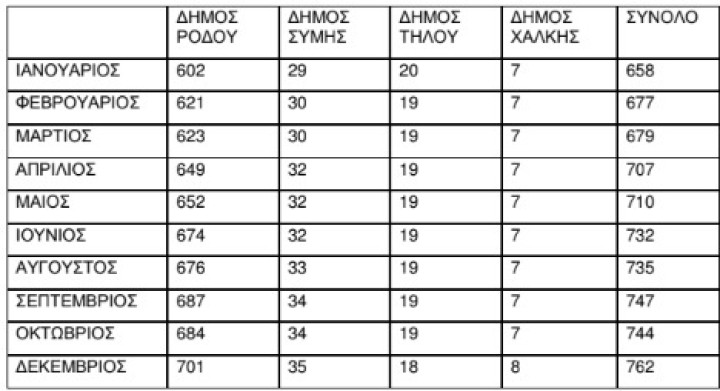 Η πλειοψηφία τους διαμένει στη Ρόδο και ο αριθμός τους κυμάνθηκε από περίπου 600 έως περίπου 700 ανάλογα τον μήνα, ενώ οι δικαιούχοι στη Σύμη ανήλθαν σε περίπου 35, στην Τήλο περίπου 20 και στη Χάλκη περίπου 7.