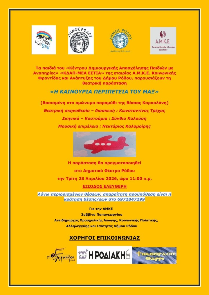 Η παράσταση θα πραγματοποιηθεί την Τρίτη 28 Απριλίου 2026, στις 11:00 π.μ., στο Δημοτικό Θέατρο Ρόδου από τα παιδιά του ΚΔΑΠ-ΜΕΑ «ΕΣΤΙΑ» της ΑΜΚΕ Κοινωνικής Φροντίδας και Ανάπτυξης του Δήμου Ρόδου.