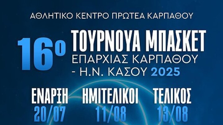 Αθλητικά 27.06.2025 11:16 Η κλήρωση και οι αγωνιστικές του 16ου τουρνουά μπάσκετ επαρχίας Καρπάθου- Κάσου