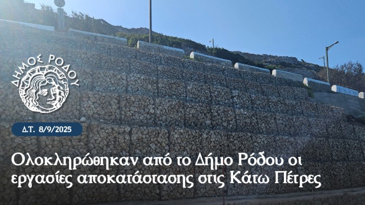 Επικαιρότητα 08.09.2025 18:15 Ολοκληρώθηκαν από το Δήμο Ρόδου οι εργασίες αποκατάστασης στις Κάτω Πέτρες