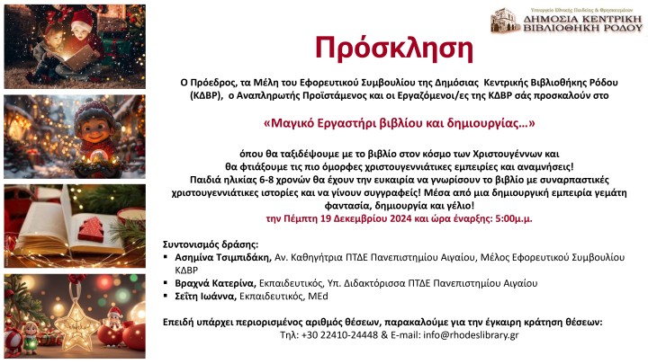 Πολιτισμός - Εκδηλώσεις 11.12.2024 13:15 «Μαγικό Εργαστήρι βιβλίου και δημιουργίας…»: Χριστουγεννιάτικο Εργαστήρι στη Βιβλιοθήκη της Ρόδου