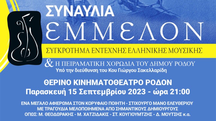 Πολιτισμός - Εκδηλώσεις 19.09.2020 20:45 Συναυλία με το συγκρότημα έντεχνης ελληνικής μουσικής «ΕΜΜΕΛΟΝ»