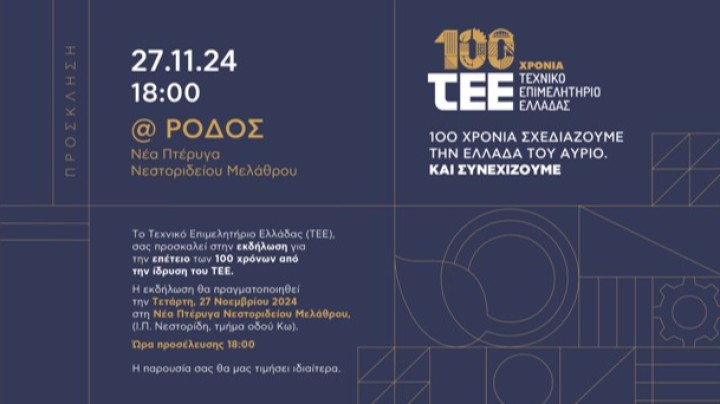 Πολιτισμός - Εκδηλώσεις 26.11.2024 11:30 Εκδήλωση για την επέτειο των 100 χρόνων από την ίδρυση του ΤΕΕ