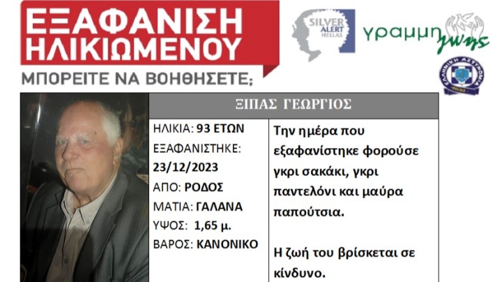Επικαιρότητα 31.12.2023 17:01 Κάμερα ασφαλείας εντόπισε τον 93χρονο να βαδίζει μόνος στη Ρόδου - Καλλιθέας- Επίσημη ανακοίνωση αναζήτησης από τo Silver Alert