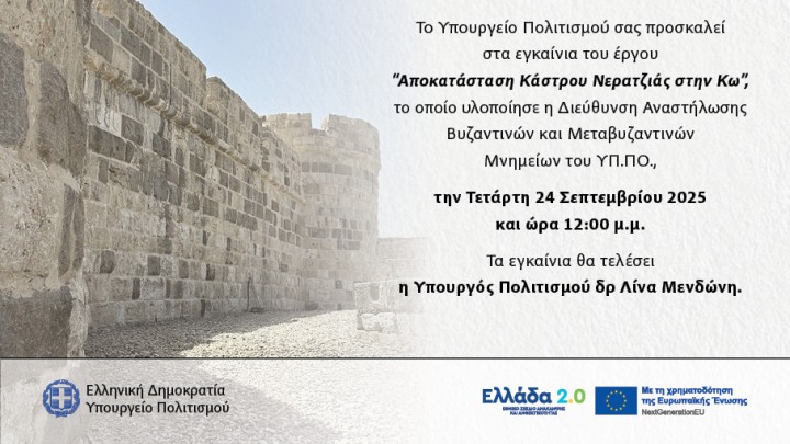 Επικαιρότητα 20.09.2025 15:45 Αποκατάσταση Κάστρου Νερατζιάς στην Κω: Εγκαινιάζεται το ιστορικό μνημείο με την παρουσία της υπουργού Πολιτισμού