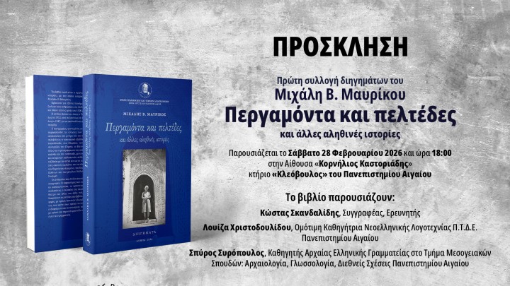 Επικαιρότητα 21.02.2026 17:00 Το ερχόμενο Σάββατο Παρουσίαση Βιβλίου του Μιχάλη Β. Μαυρίκου "Περγαμόντα και Πελτέδες και άλλες αληθινές ιστορίες."