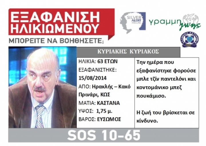 Επικαιρότητα 16.08.2023 16:27 Εκδόθηκε Silver Alert για τον 88χρονο συμπολίτη μας από την Κρητηνία που αγνοείται - Άκαρπες έως τώρα οι προσπάθειες εντοπισμού του